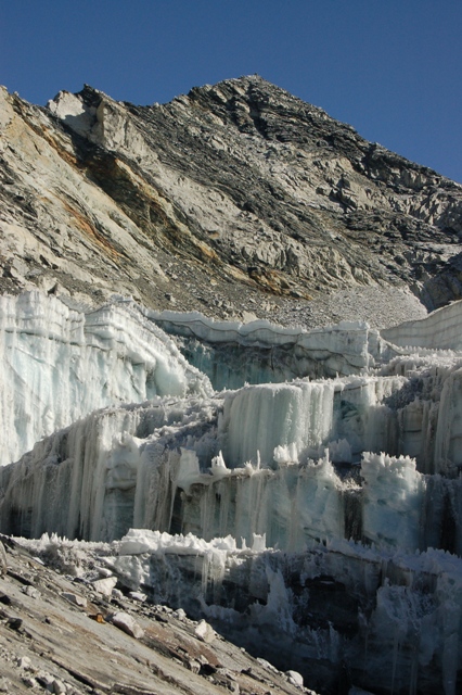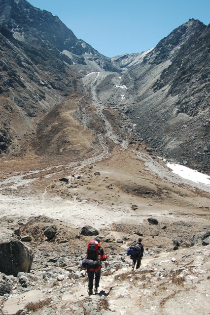 Ráno se vydáváme intuitivně ve směru vyznačené cesty v mapě. Cesta není vyšlapaná, ale není kam zabloudit. Obtížněji se vyhoupneme na skalní práh, který obchází torzo původního ledovce. Ale i tak ledovcová stěna vypadá vcelku nebezpečně. Snahou je se dostat do uzávěru doliny, jenž končí sedlem. Traverzujeme prudký svah ujíždějící sutí, která je tvořena pásy různých frakcí. Tou nejhorší je jemný štěrk, na které si připadáme jak na zledovatělé skluzavce. Suť hluboce pod námi sjíždí do jakési obrovské průrvy mezi stěnou a ledovcem. Náš postup spíše připomíná poklus, nikomu se nechce sjet až dolů. Klíčovým a zároveň tak trochu osudným místem se nám staly plotny vedoucí do sedla. Místa z černé břidlice byla suchá, ale natolik zvětralá, že se nedalo vůbec lézt. Najít chyt aniž by vám nezůstal v ruce bylo docela obtížné. Oproti světlé krystalické plotny jsou vcelku kompaktní, ale pěkně zledovatělé. Trek je skoro u konce a zbytečně riskovat se nám vůbec nechce. Raději se obracíme a vracíme se k stanovišti. Cestou zpátky míjíme suťovitě, po kterém by se snad mohlo vystoupit na tížený hřeben k vrcholu. Při pohledu na hodinky je rozhodnuto, další 2 – 3 hodiny ve výstupu si opravdu dovolit nemůžeme. Do stanu se dostáváme úplně jinou stezkou než kterou jsme ráno stoupali. Dokonce narážíme na pár mužíků, kterých se nemá cenu vůbec držet.