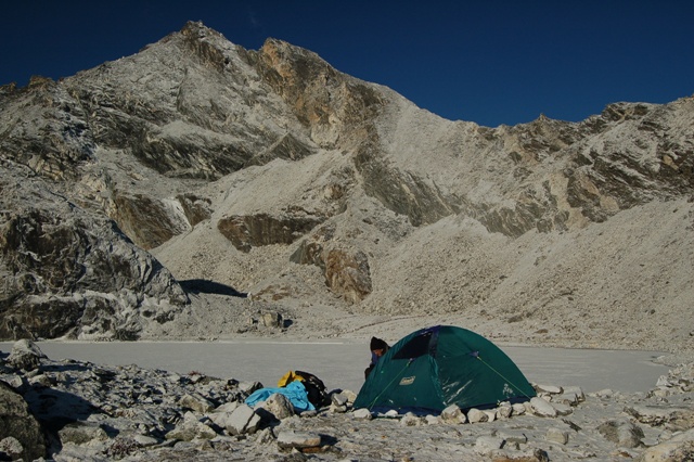 Stanoviště rozkládáme pár minut pod sedlem u zamrzlého jezera, pod vrcholem Pokalde (s povolením lze také vystoupit). Míst na stanovení je tu dost a jsou šikovně schována před možným padajícím zbloudilým kamenem. Není třeba hledat vyznačené high campy na mapě, stejně jsou na každé z nich zakresleny jinak. V noci nás nejprve překvapuje bouřka následovaná mírným, ale za to vytrvalým sněžením. Co více si můžeme přát než „klidný spánek“. Noční kontrola teploměru nás uklidňuje, - 15 ºC se v mém stařičkém Hannahu dá přežít..